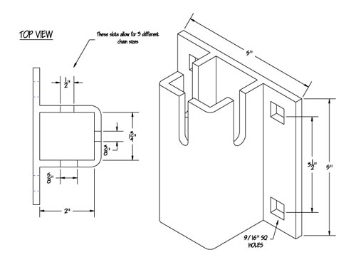 | (H-CRS) Our Chain Retainer bolts to the side of your dock and uses chain to hold the dock in place. You can use 5/16", 3/8" or 1/2"chain. Use either (2) H-W or (1) B as back up plates. 5" L x 5" H. |