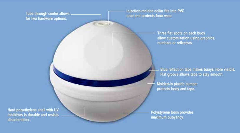 The hard polyethylene shell has UV inhibitors to keep it looking new. Polystyrene foam fills the shell to provide maximum buoyancy. A PVC tube is molded through the center of the buoy to allow for different hardware options. An injection-molded collar captures the tube on each end and protects the buoy from wear.